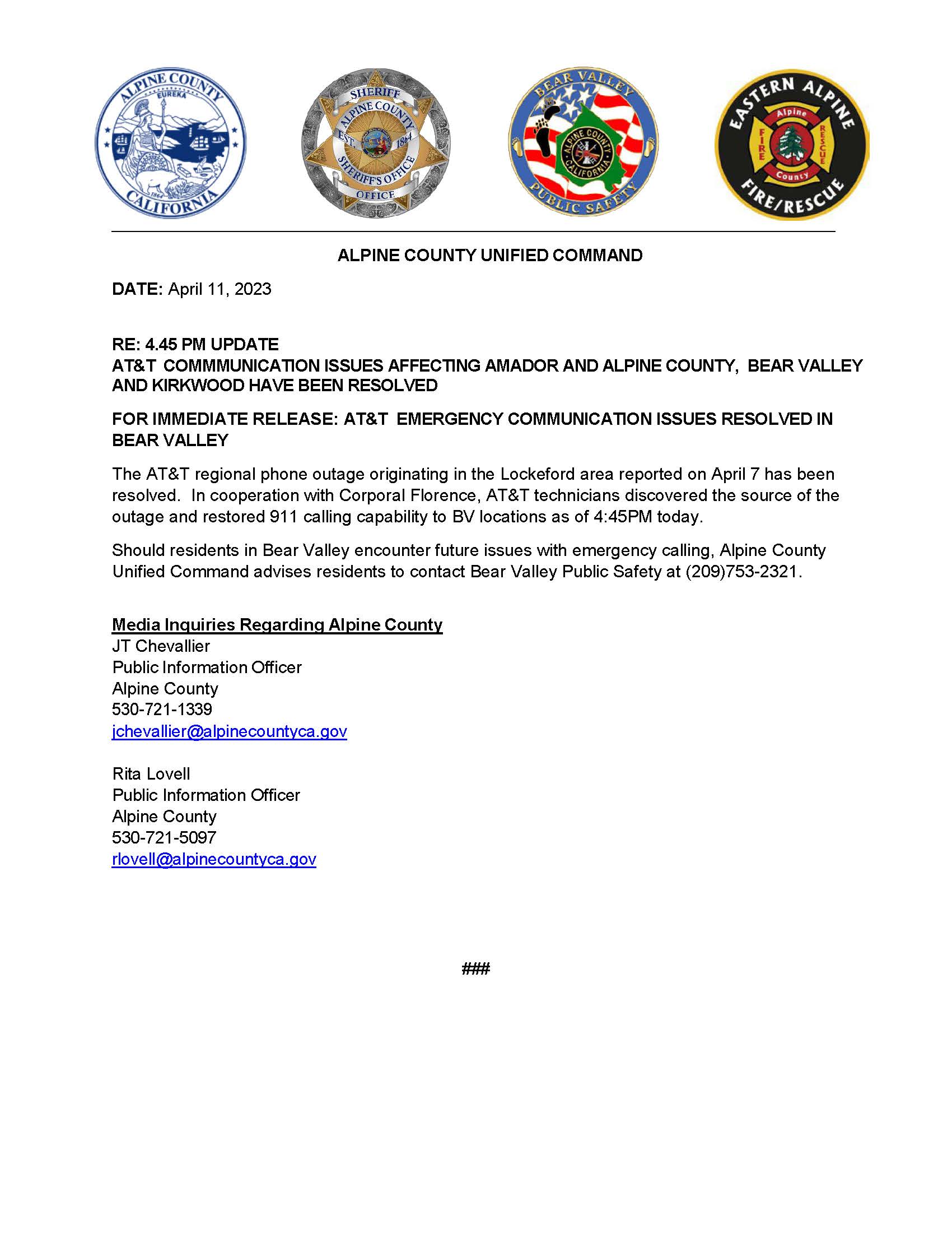 4-11-23 noon UPDATE-- AT&T still working to resolve communications issues in Bear Valley. If BV residents experiencing an outage need to call 911, Alpine County Unified Command advises contacting Bear Valley Public Safety at (209)753-2321