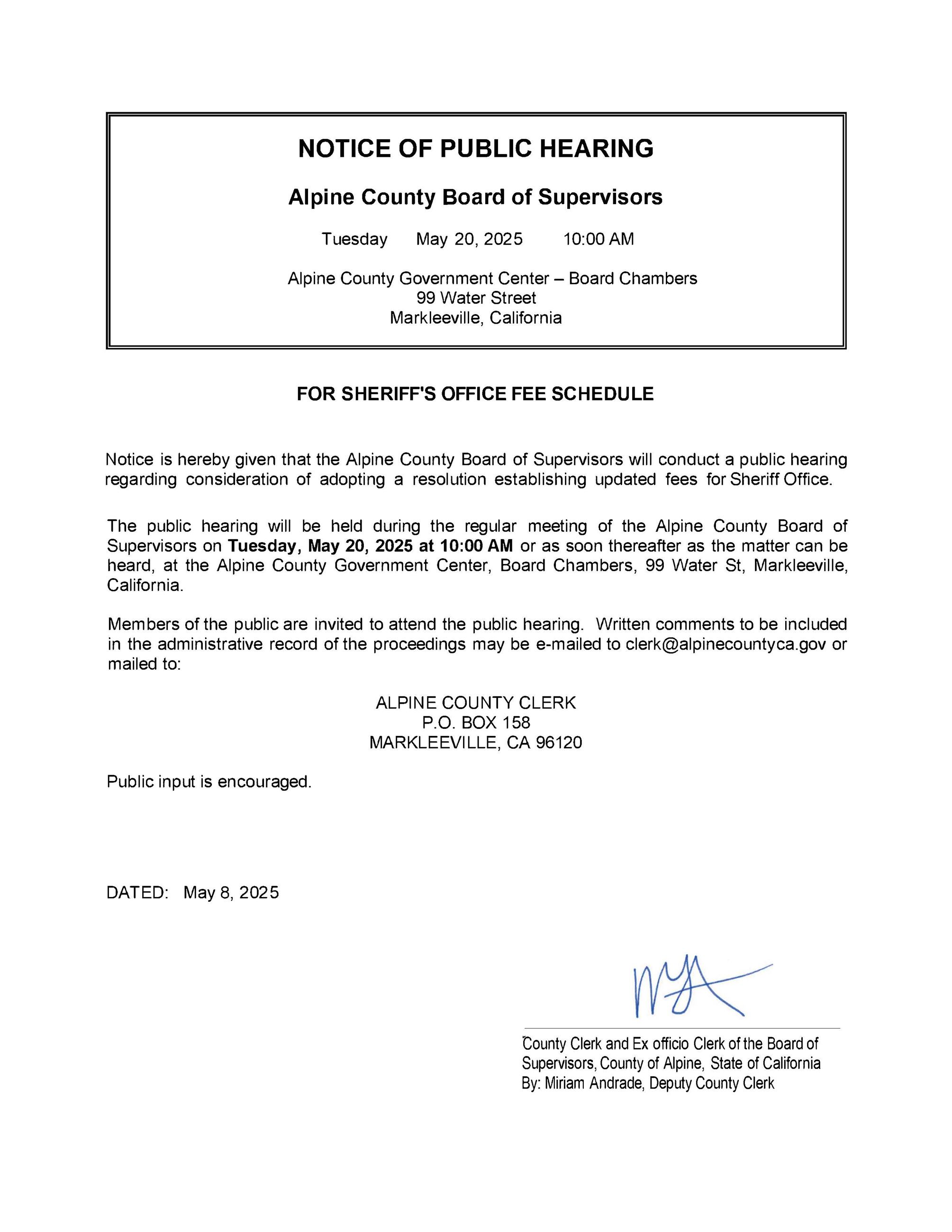 The public hearing will be held during the regular meeting of the Alpine County Board of