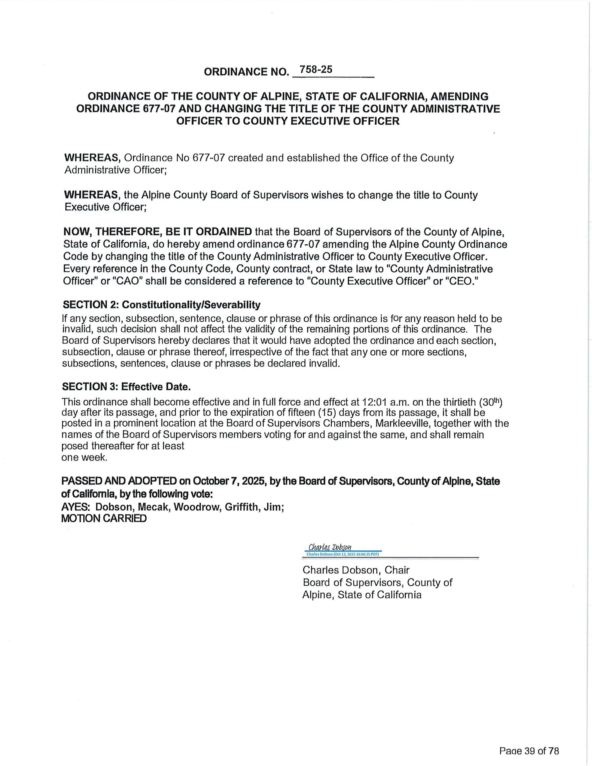 NOW, THEREFORE, BE IT ORDAINED that the Board of Supervisors of the County of Alpine, State of California, do hereby amend ordinance 677-07 amending the Alpine County Ordinance Code by changing the title of the County Administrative Officer to County Executive Officer. Every reference in the County Code, County contract, or State law to "County Administrative Officer" or "CAO" shall be considered a reference to "County Executive Officer" or "CEO."
